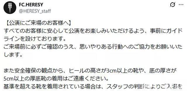 日本乐团theGazettE,早就把话说得很清楚了 今年5月,日本视觉系乐团 theGazettE(加泽特) 在演唱会前,官方就发布过明确公告: 为确保所有观众的安全,禁止穿着:鞋跟高于3厘米,或鞋底厚于5厘米的厚底鞋,不符合规定者,工作人员有权拒绝入场。